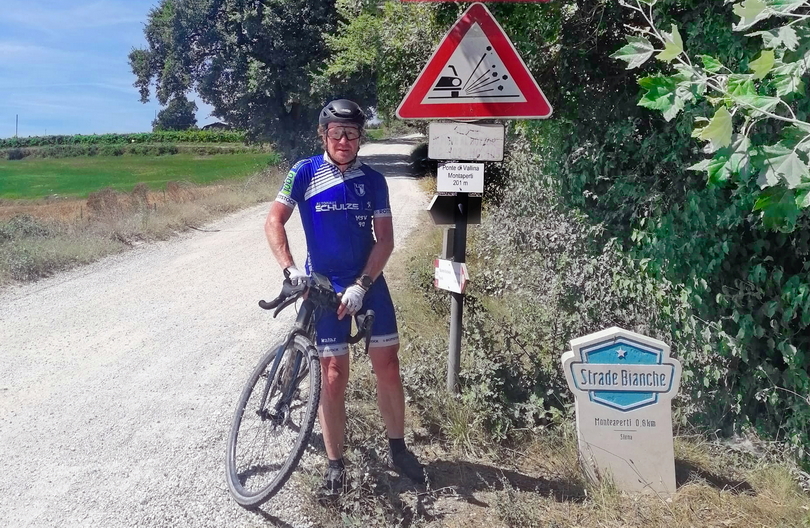 Das obige Foto zeigt Stephan im MaWa-Trikot bei einer Trainingsfahrt auf der berühmten Rennstrecke über Schotterstraßen. |