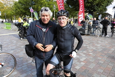 Reiner und Stephan bei der WaMa-Tour 2018 (Foto links - Stephan war damals als Rennleiter im Einsatz). Günter und Stephan beim diesjährigen Radrennen "Rund um den Dom" (Foto rechts). |
