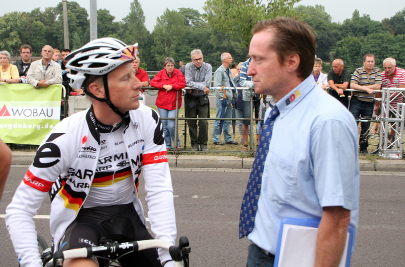 Vor dem Rennen ein Gespräch zwischen Fabian Wegmann und Stephan Gottschling. Beide waren sehr erfolgreiche Radrennfahrer. Fabian wurde dreimal Deutscher Meister (2007, 2008, 2012) und Stephan zweimal (1992, 1994). |
