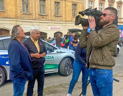 Friedensfahrtlegende Thomas Barth und unser Berichterstatter Karel Gerolt bei der 52. Friedensfahrt der Junioren im Intervierw mit dem tschechischen Fernsehen.
