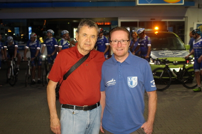 Reiner und Stephan bei der WaMa-Tour 2018 (Foto links - Stephan war damals als Rennleiter im Einsatz). Günter und Stephan beim diesjährigen Radrennen "Rund um den Dom" (Foto rechts). |