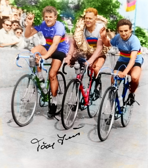 Täve Schur siegte im Jahre 1959 im Weltmeistertrikot beim Radklassiker "Harzrundfahrt" vor Erich Hagen und Bernd Eckstein.