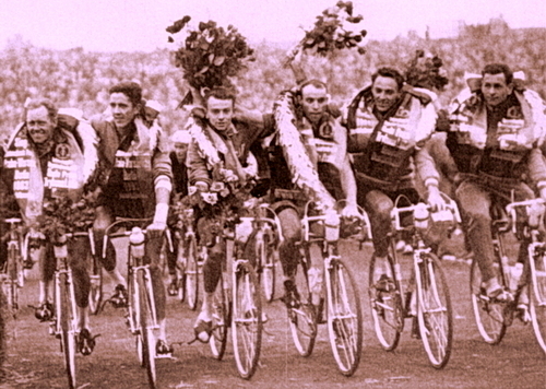 Die drei im Buch beschriebenen Helden der Landstraße bei einem ihrer größten Erfolge: Gustav Adolf "Täve" Schur, Lothar Appler, Günter Lux, Klaus Ampler, Manfred Brüning und Manfred Weißleder (v.l.n.r.)