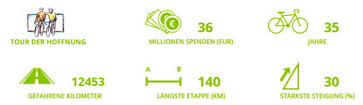 In den vielen Jahren, seitdem die erste Tour von Gießen nach Hamburg radelte, sind unglaubliche 36 Millionen Euro zusammen gekommen. Spenden, die bis auf den letzten Cent den kranken Kindern und Jugendlichen zugute kamen, während die Kosten der Tour von namhaften Firmen und Institutionen oder von den Teilnehmern selber getragen werden.