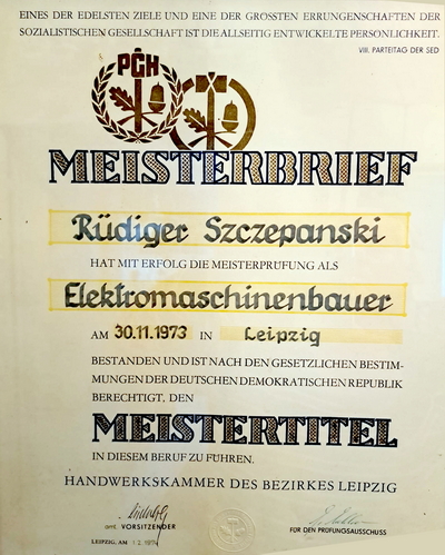 Im Jahre 2006 ging er in den wohlverdienten Ruhestand. Im November dieses Jahres wird er von der Handwerkskammer Leipzig seinen "Goldenen Meisterbrief" erhalten. Diese besondere Ehrung gibt es zum 50. Jahrestages des Meisterbriefes. |