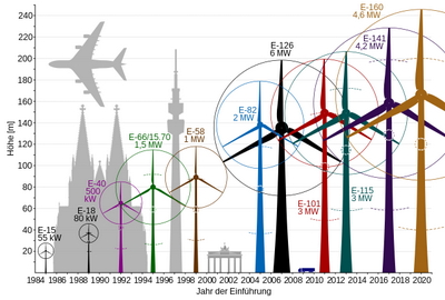 Die Skizze verdeutlicht bei Windrädern das Verhältnis von Größe und elektrischer Leistung bei der Stromerzeugung. |