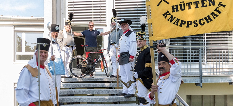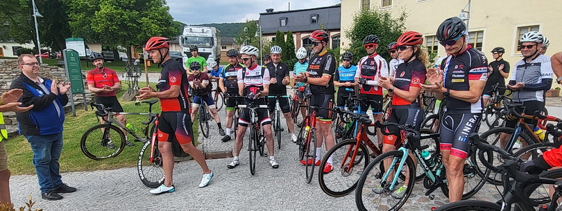 In der Saigerhütte Olbernhau (Unesco-Weltkulturerbe Montanunion Erzgebirge) wurden die Radsportler von Mitarbeitern begrüßt und auf die Route nach Halsbrücke geschickt. Ehrengast Olaf Ludwig ist der 3.v.r. |