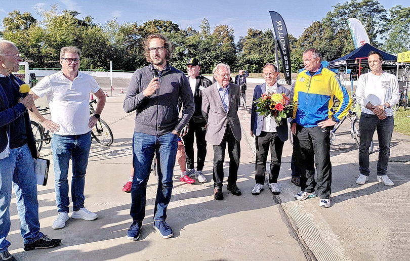 Der OB der Stadt Merseburg, Herr Müller-Bahr (Bildmitte mit Mikrofon), würdigte in seiner Ansprache das besondere Engagement derer, die es geschafft haben, in einer Kürze (2 Monate), die Radrennbahn wieder zu einem sportlichen Domizil in Merseburg zu gestalten. Den Machern sprach er seinen Dank aus.