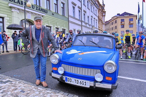 "Mister Friedensfahrt", Täve Schur, bei der 50. Friedensfahrt der Junioren mit dem blauen FF-Trabi. Hinter dem Lenkrad sitzt sein Freund Karel Gerolt. |