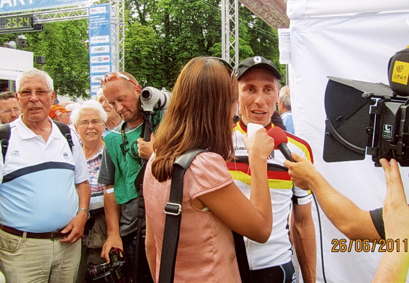 Richard (1.v.l.) überglücklich am 26.06.2011. Robert Wagner, sein Enkel, wurde in Neuwied deutscher Meister im Straßenrennen, indem er sich im Sprint vor Gerald Ciolek und John Degenkolb durchsetzte. Heute ist Robert Sportlicher Leiter beim Team Visma-Lease Bike Development. |