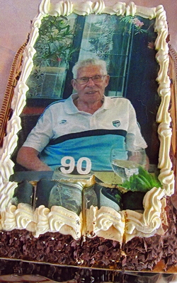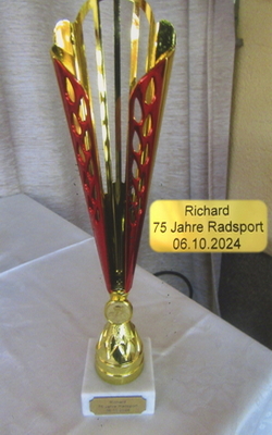 | Richard war über Jahrzehnte Trainer. Einer seiner erfolgreichsten Fahrer war Henry Kühlhorn, der ihm einen Pokal (Foto links) aus Anlaß "75 Jahre Radsport" überreichte. Rechts ist die Torte zum 90. Geburtstag von Richard zu sehen. |