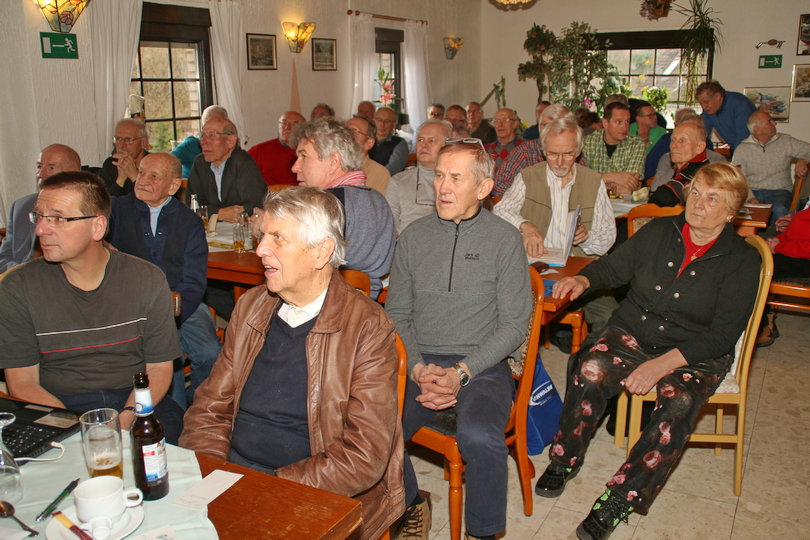 Dr. Werner Gutzer (vorn in der ersten Reihe rechts) beim Radsporttreffen in Halle/Sa. im Jahre 2016. Er folgte hier den Ausführungen von Dr. Reinhard Buchheim, der einen Beamer-Vortrag über die Leistungen einiger Hallenser