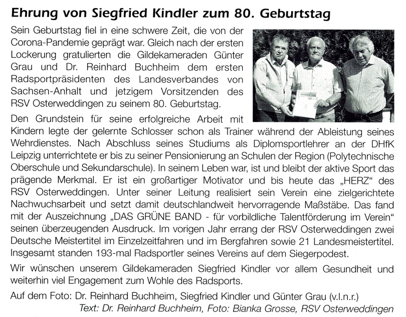 Siegfried Kindler zum Geburtstag zu gratulieren bedeutet Einfallsreichtum. Er wurde im April 85 Jahre und war selbst zu dieser Zeit mit seinem über alles geliebten Radsport beschäftigt. Für ihn stand die Vorbereitung der Landesmeisterschaften von Sachsen-Anhalt zusammen mit Sachsen im Mittelpunkt. Seit 14 Jahre ist er Ausrichter dieses Zeitfahrens