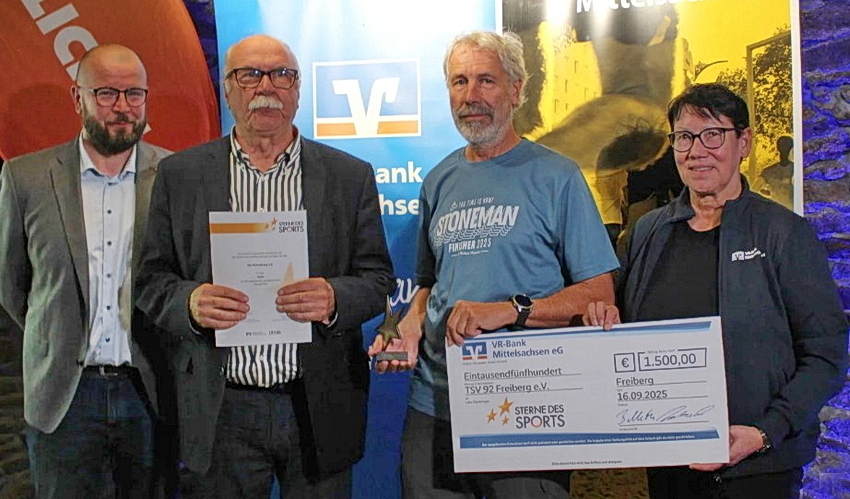 Die Ehrung überreichten Angelika Belletti (1.v.r.), Vorständin der VR-Bank Mittelsachsen eG, gemeinsam mit Benjamin Kahlert (2.v.r.), Geschäftsführer des Kreissportbundes Mittelsachsen e.V., und Marion Schreiber (1.v.li.) vom BLICK Freiberg.